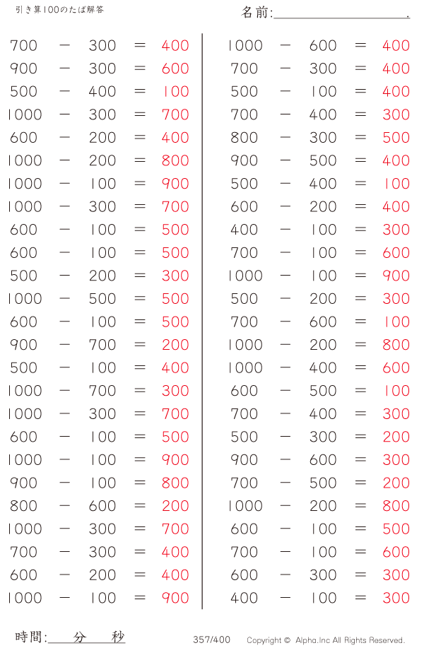 上記のボタンから「引き算100のたば」の算数数学ドリル・計算ドリル(PDFプリント)がダウンロードできます。個人利用は無料です(家庭以外での配布は有料です)。