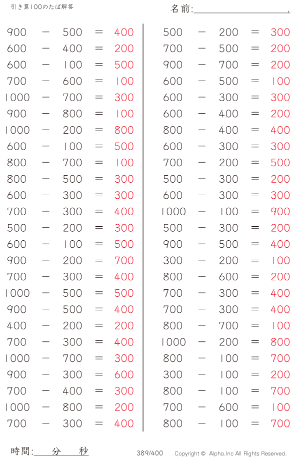 上記のボタンから「引き算100のたば」の算数数学ドリル・計算ドリル(PDFプリント)がダウンロードできます。個人利用は無料です(家庭以外での配布は有料です)。