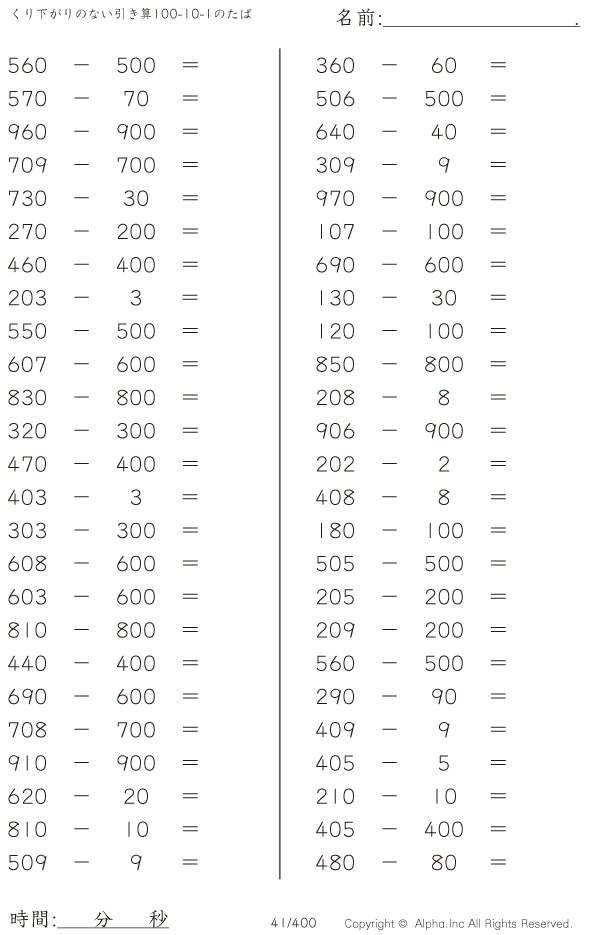 くり下がりのない引き算100-10-1のたば [問題]041/400