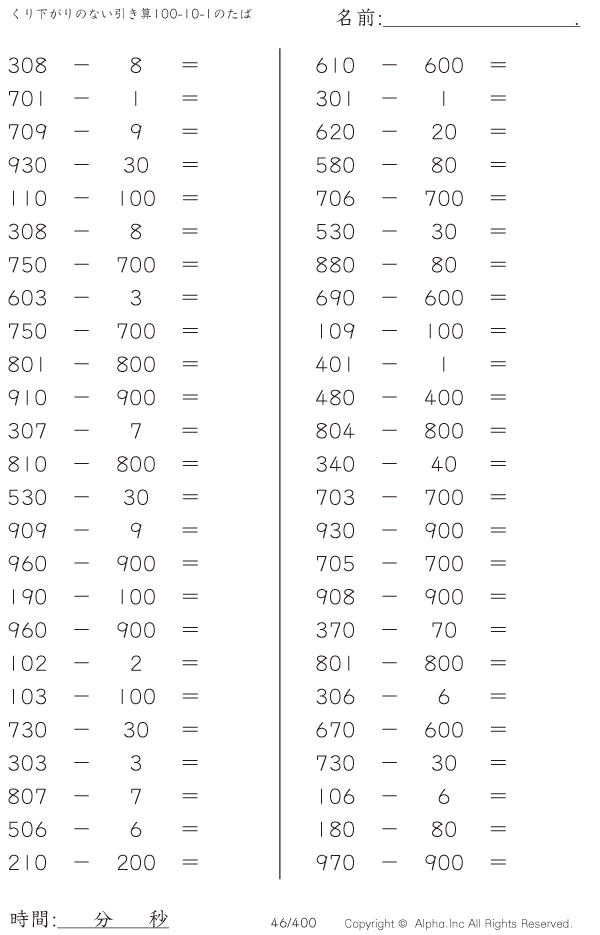 くり下がりのない引き算100-10-1のたば [問題]046/400