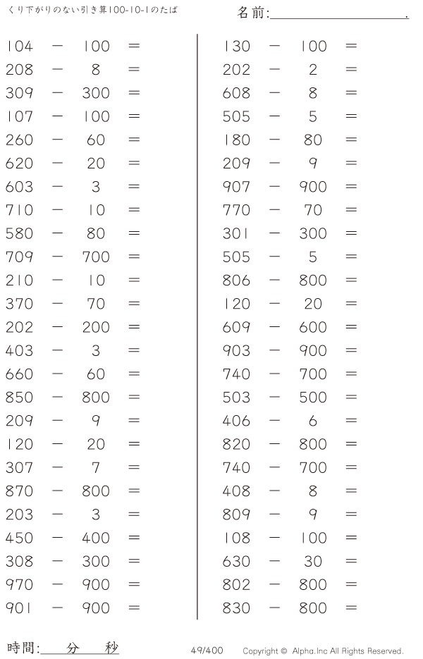 くり下がりのない引き算100-10-1のたば [問題]049/400