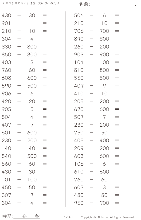 くり下がりのない引き算100-10-1のたば [問題]062/400