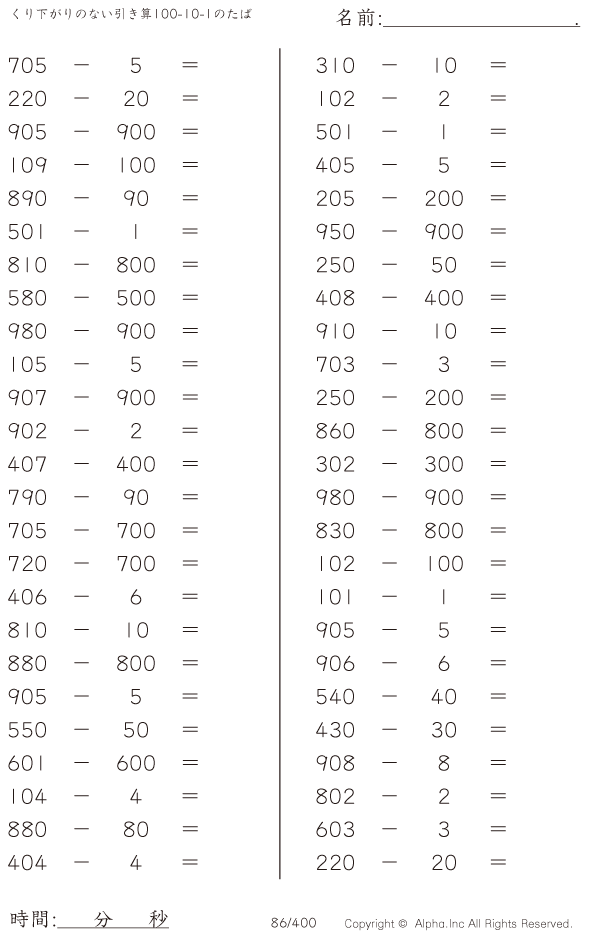 くり下がりのない引き算100-10-1のたば [問題]086/400
