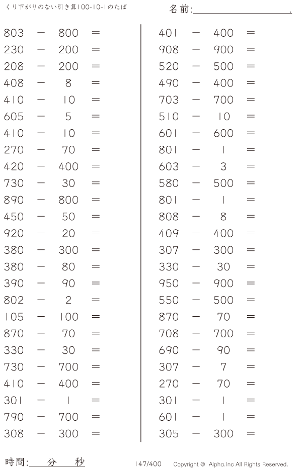 くり下がりのない引き算100-10-1のたば [問題]147/400