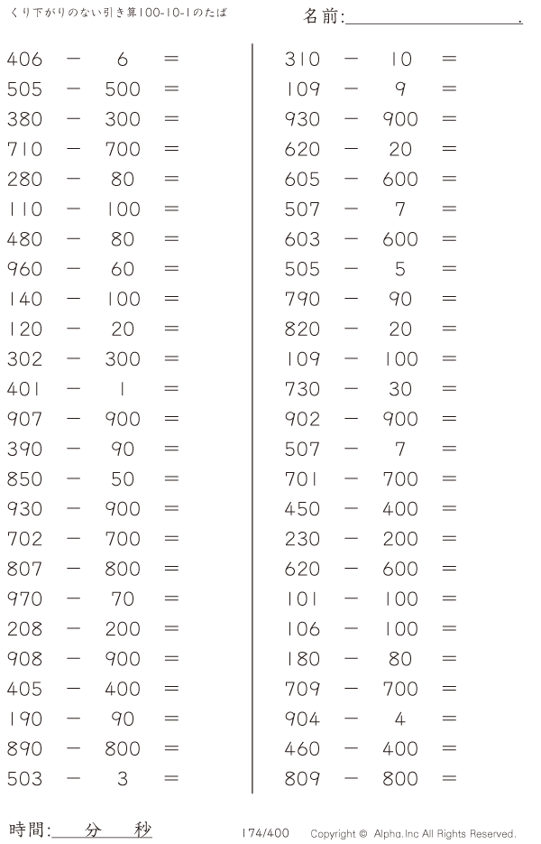 くり下がりのない引き算100-10-1のたば [問題]174/400