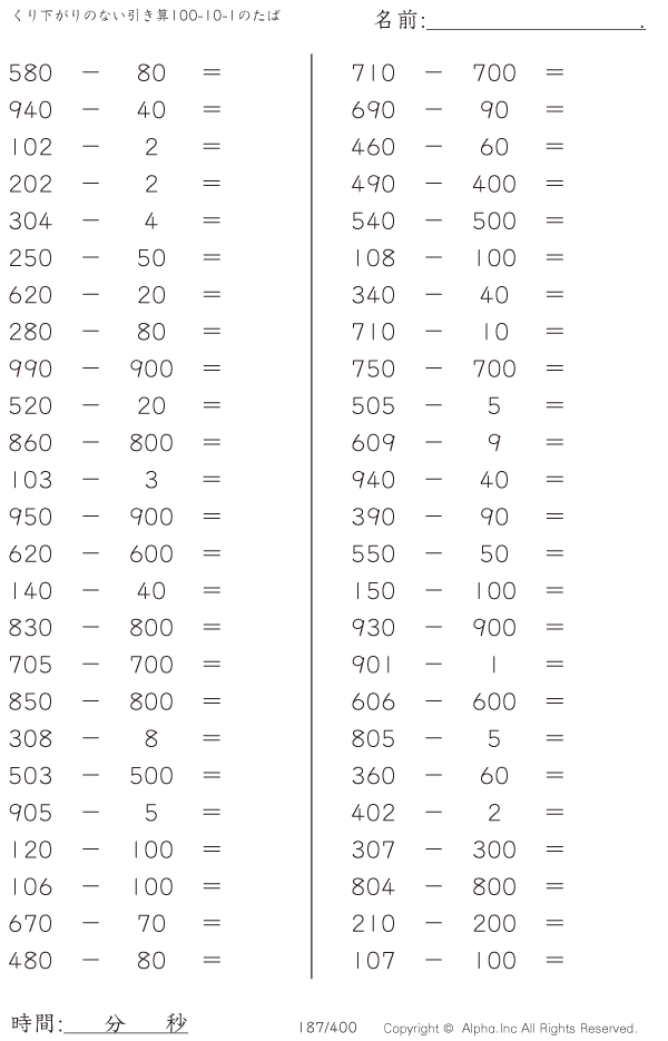 くり下がりのない引き算100-10-1のたば [問題]187/400