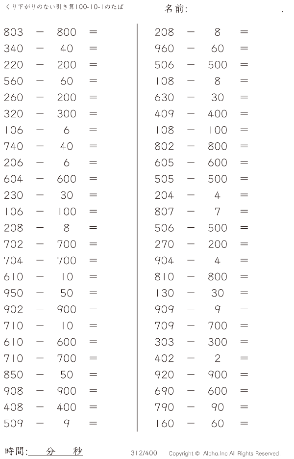 くり下がりのない引き算100-10-1のたば [問題]312/400