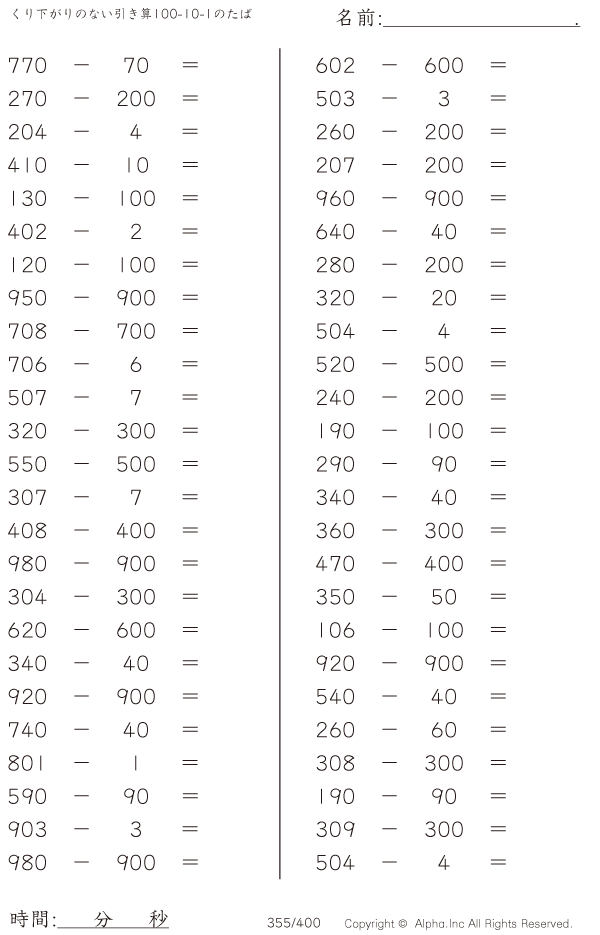 くり下がりのない引き算100-10-1のたば [問題]355/400