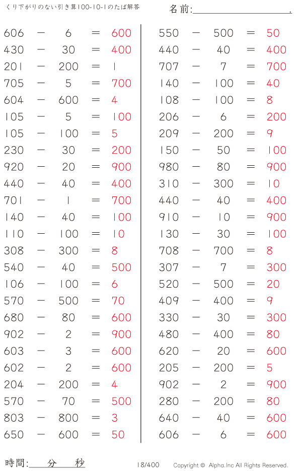 くり下がりのない引き算100-10-1のたば [解答]018/400