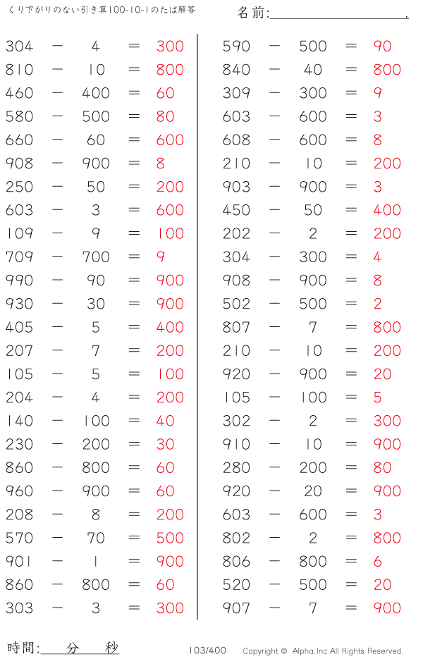 くり下がりのない引き算100-10-1のたば [解答]103/400