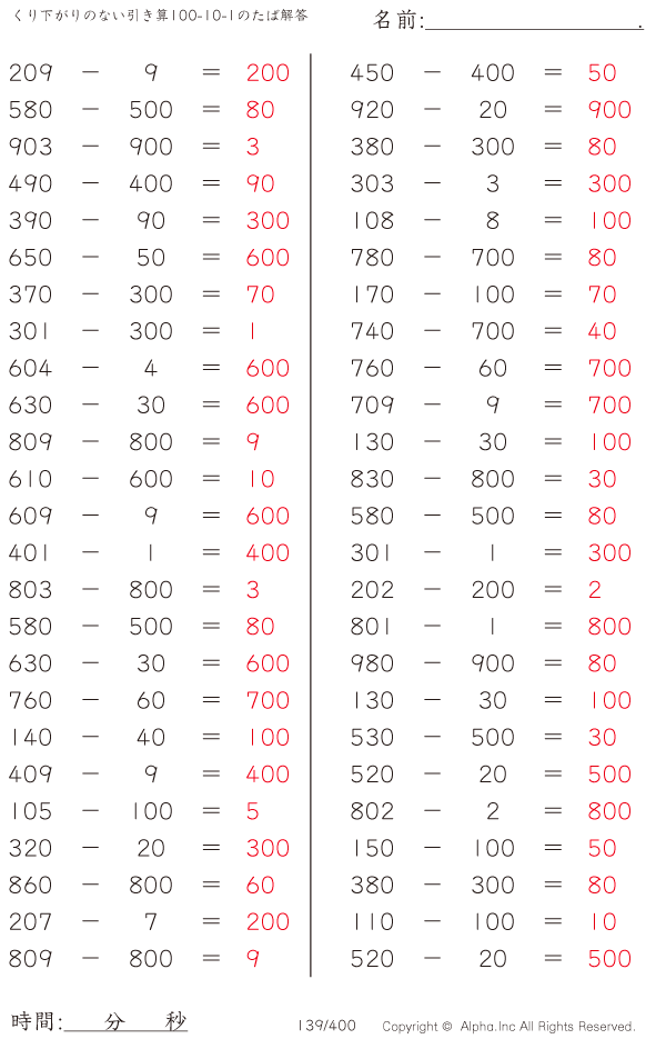 くり下がりのない引き算100-10-1のたば [解答]139/400