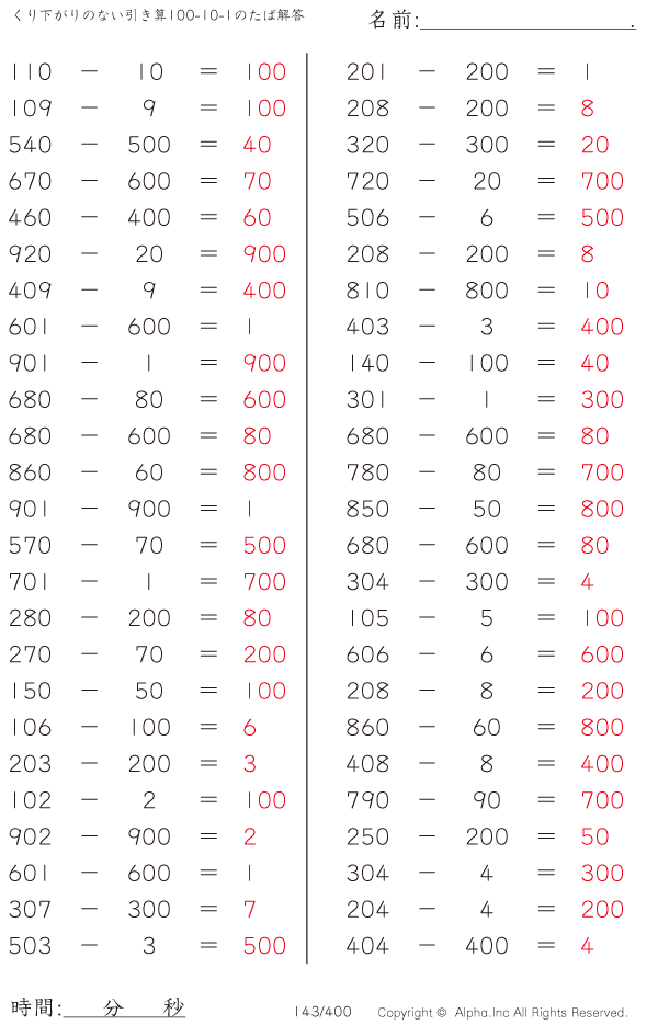 くり下がりのない引き算100-10-1のたば [解答]143/400