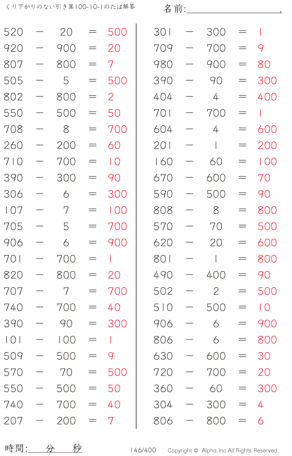 くり下がりのない引き算100-10-1のたば [解答]146/400