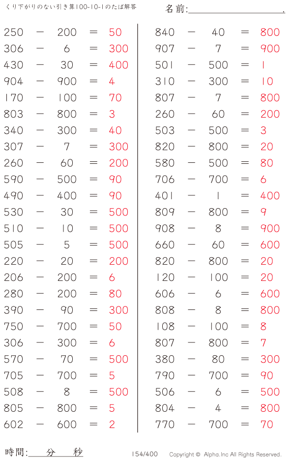 くり下がりのない引き算100-10-1のたば [解答]154/400