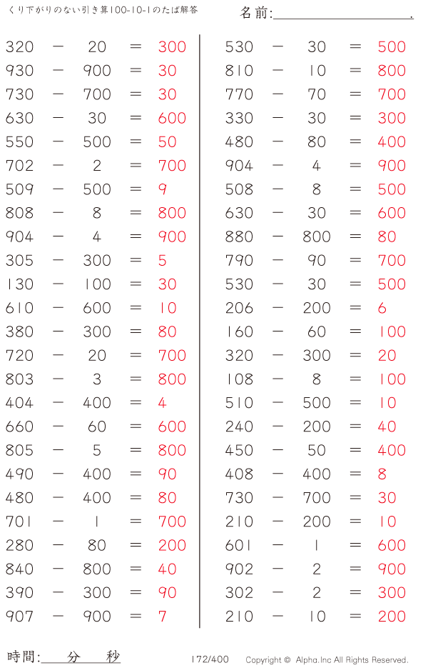 くり下がりのない引き算100-10-1のたば [解答]172/400