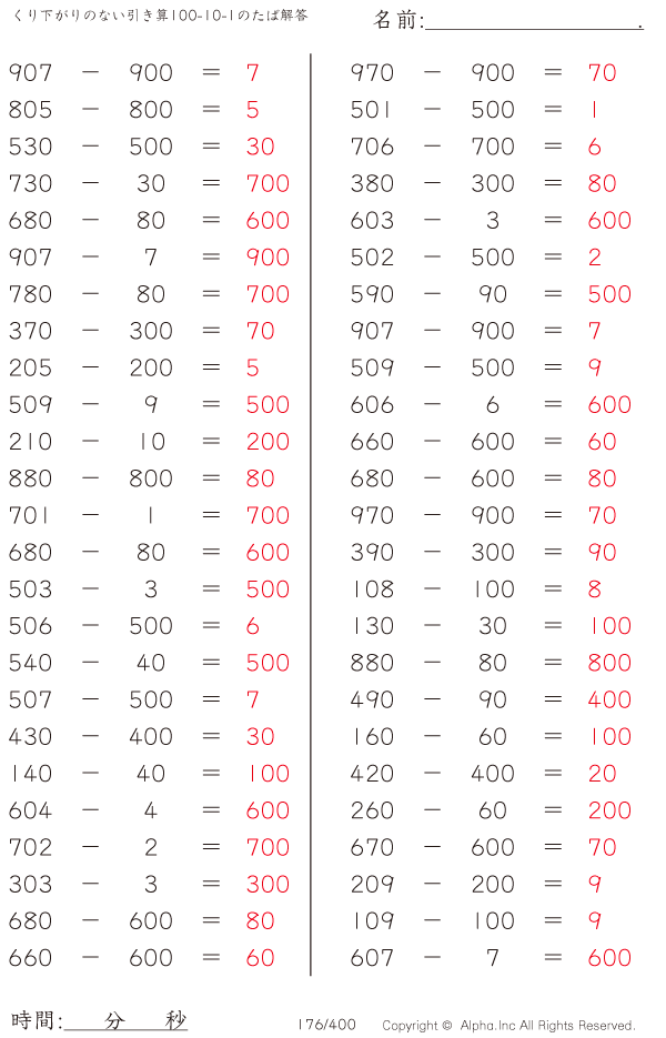 くり下がりのない引き算100-10-1のたば [解答]176/400