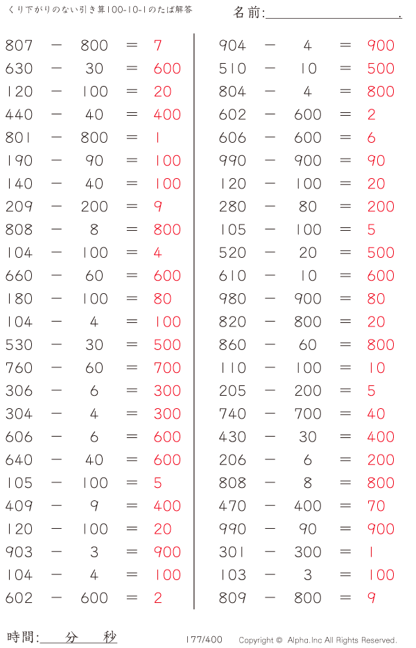 くり下がりのない引き算100-10-1のたば [解答]177/400