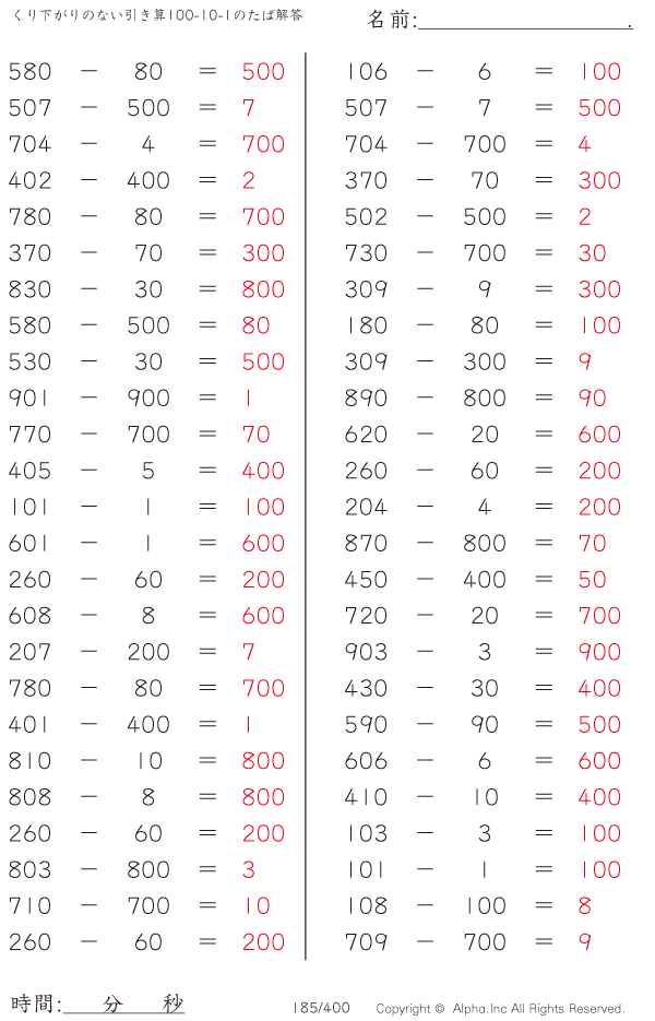くり下がりのない引き算100-10-1のたば [解答]185/400