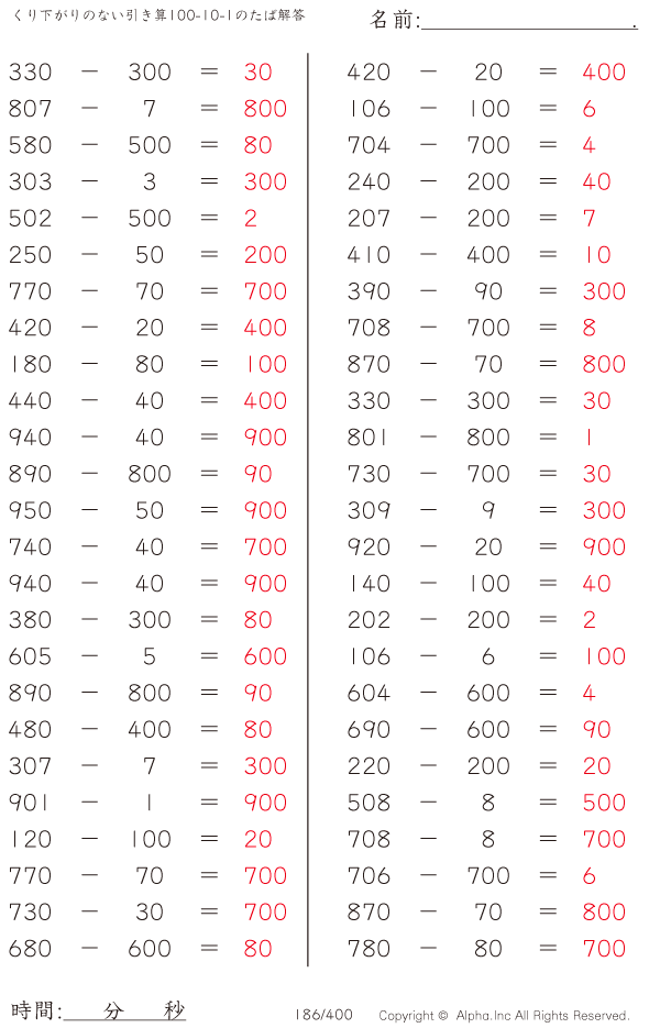 くり下がりのない引き算100-10-1のたば [解答]186/400