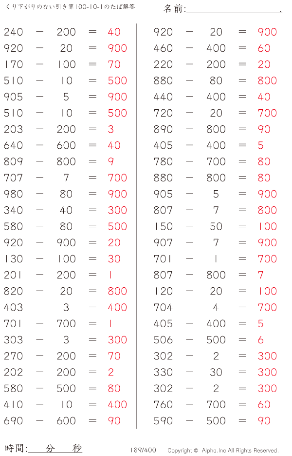 くり下がりのない引き算100-10-1のたば [解答]189/400