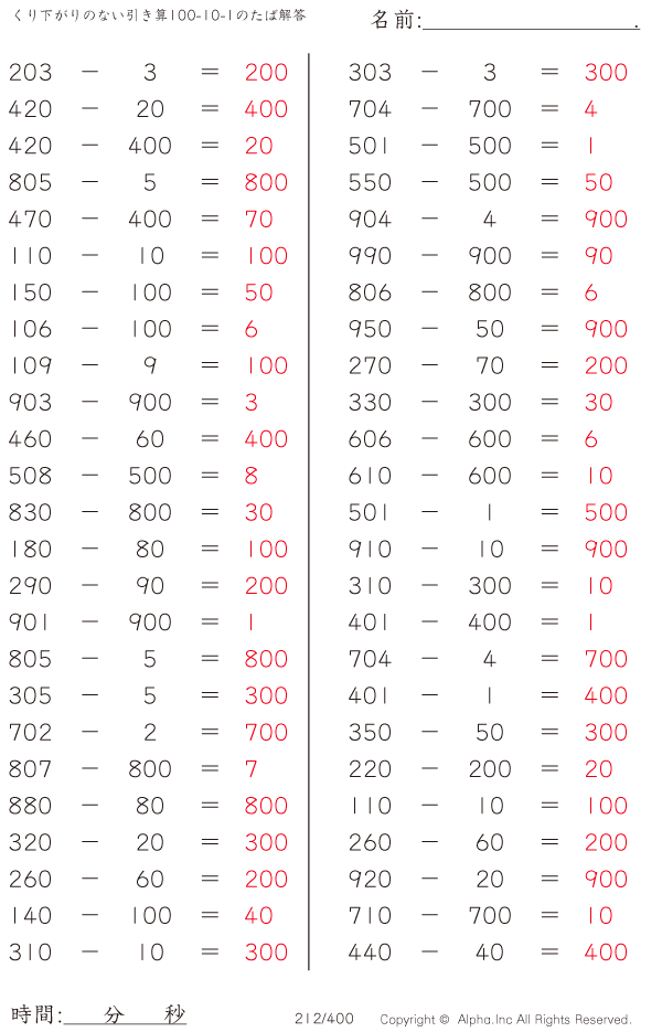 くり下がりのない引き算100-10-1のたば [解答]212/400