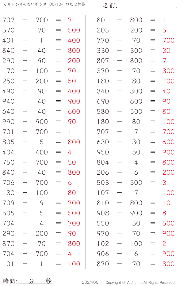 くり下がりのない引き算100-10-1のたば [解答]232/400
