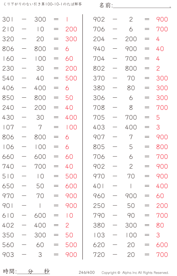 くり下がりのない引き算100-10-1のたば [解答]246/400