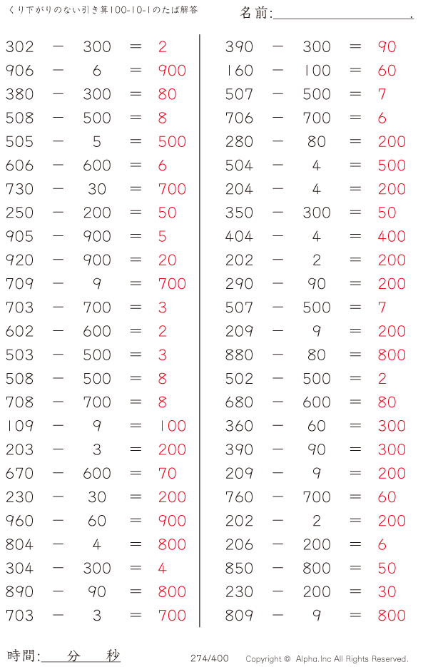 くり下がりのない引き算100-10-1のたば [解答]274/400