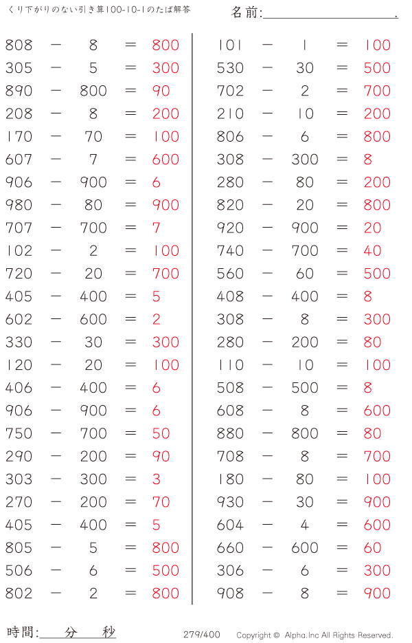 くり下がりのない引き算100-10-1のたば [解答]279/400