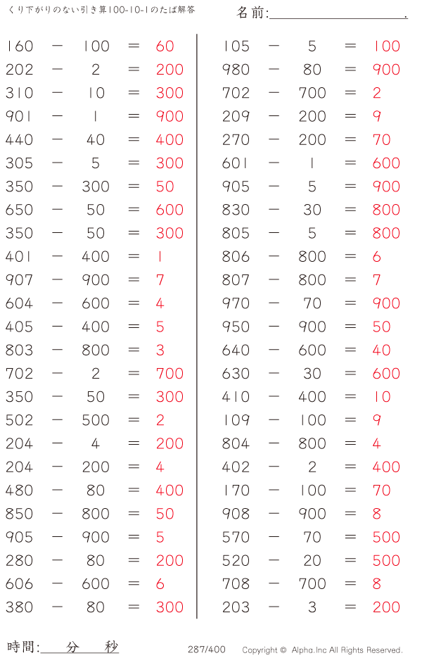 くり下がりのない引き算100-10-1のたば [解答]287/400