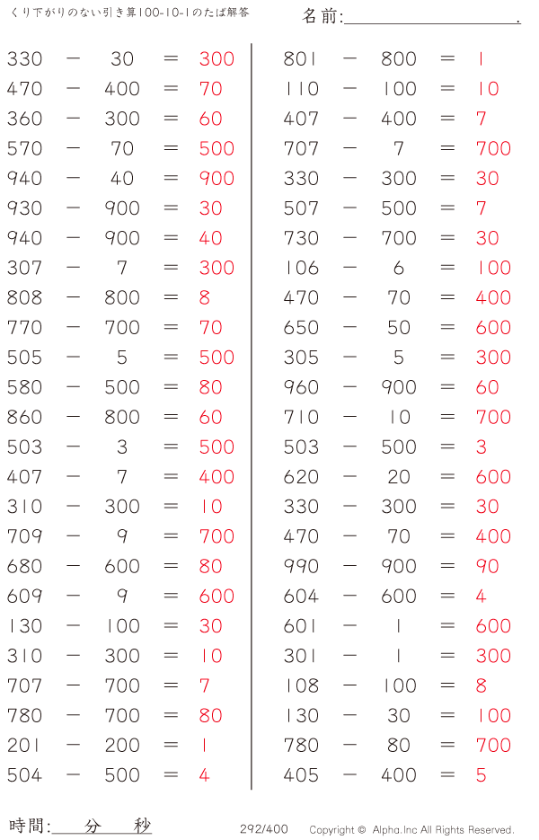 くり下がりのない引き算100-10-1のたば [解答]292/400