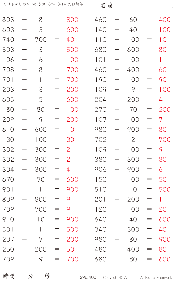 くり下がりのない引き算100-10-1のたば [解答]296/400