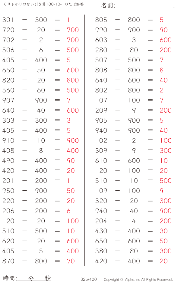 くり下がりのない引き算100-10-1のたば [解答]325/400