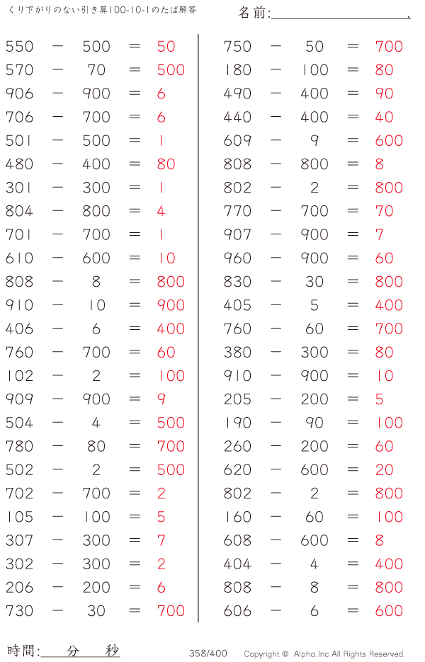 くり下がりのない引き算100-10-1のたば [解答]358/400