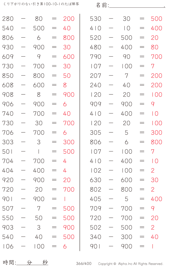 くり下がりのない引き算100-10-1のたば [解答]366/400