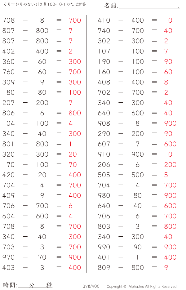 くり下がりのない引き算100-10-1のたば [解答]378/400