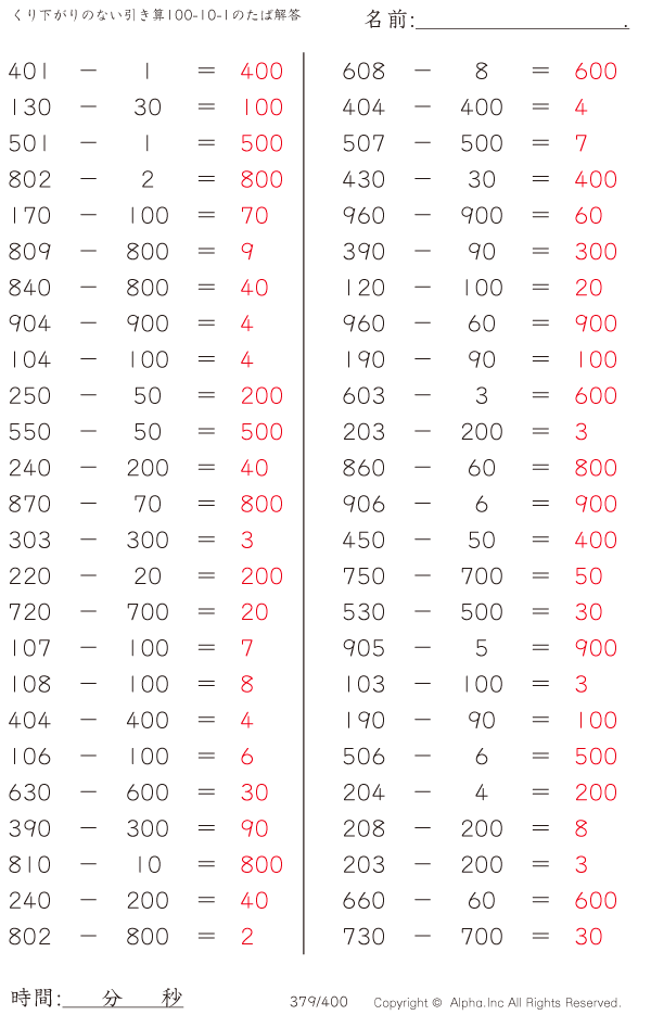くり下がりのない引き算100-10-1のたば [解答]379/400