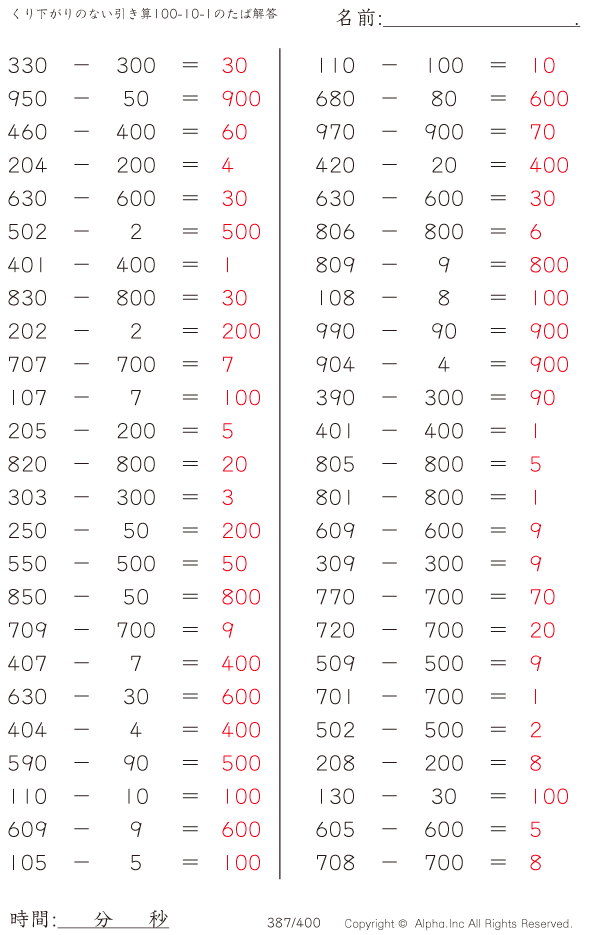 くり下がりのない引き算100-10-1のたば [解答]387/400
