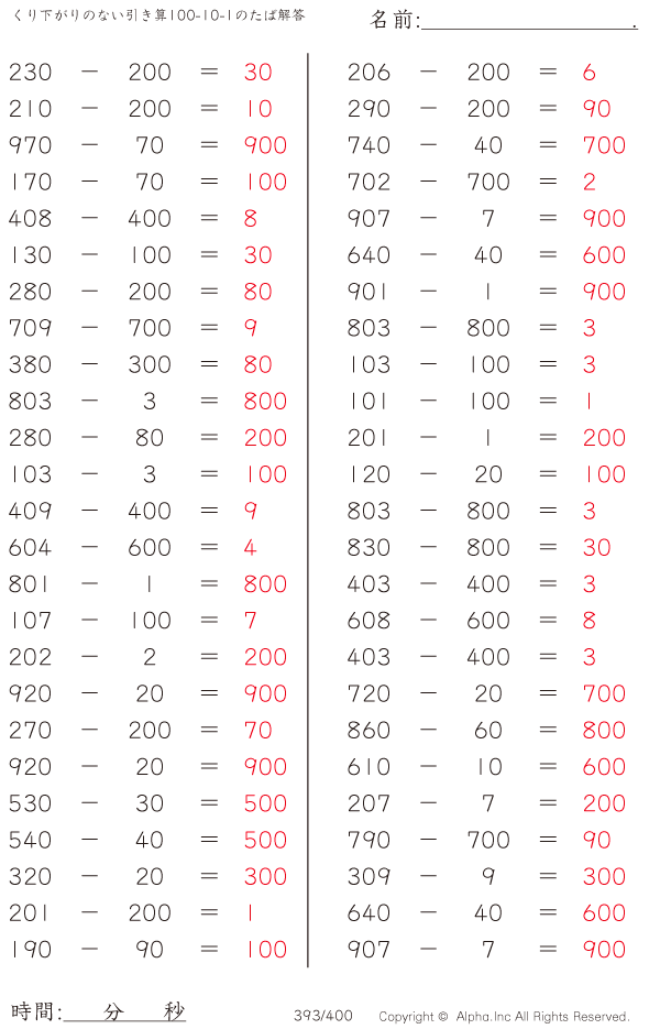くり下がりのない引き算100-10-1のたば [解答]393/400