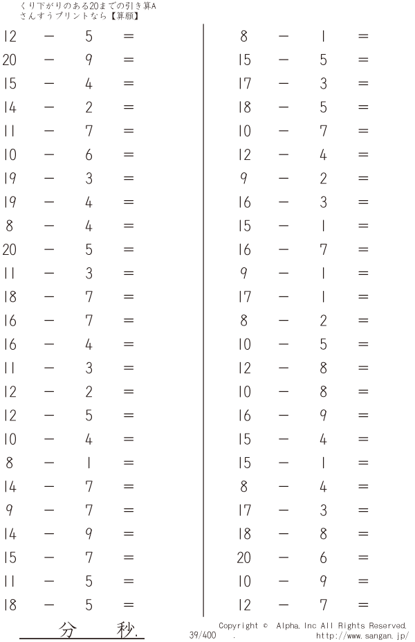 上記のボタンから「くり下がりのある20までの引き算A(1桁で引く)」の算数数学ドリル・計算ドリル(PDFプリント)がダウンロードできます。個人利用は無料です(家庭以外での配布は有料です)。