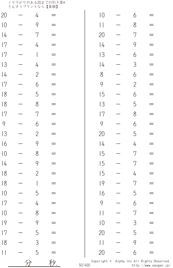 上記のボタンから「くり下がりのある20までの引き算A(1桁で引く)」の算数数学ドリル・計算ドリル(PDFプリント)がダウンロードできます。個人利用は無料です(家庭以外での配布は有料です)。