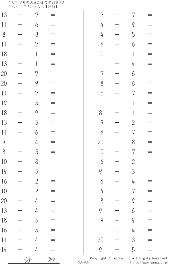 上記のボタンから「くり下がりのある20までの引き算A(1桁で引く)」の算数数学ドリル・計算ドリル(PDFプリント)がダウンロードできます。個人利用は無料です(家庭以外での配布は有料です)。