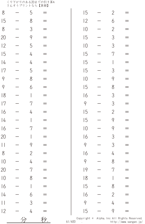 上記のボタンから「くり下がりのある20までの引き算A(1桁で引く)」の算数数学ドリル・計算ドリル(PDFプリント)がダウンロードできます。個人利用は無料です(家庭以外での配布は有料です)。