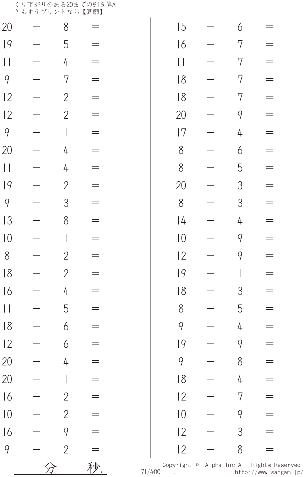 上記のボタンから「くり下がりのある20までの引き算A(1桁で引く)」の算数数学ドリル・計算ドリル(PDFプリント)がダウンロードできます。個人利用は無料です(家庭以外での配布は有料です)。