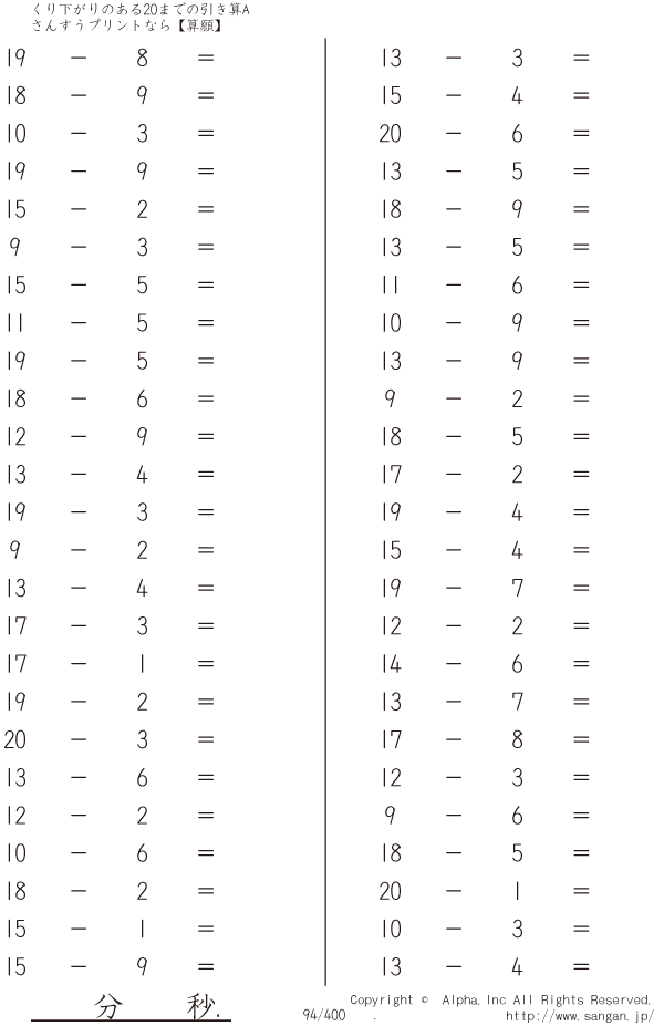 上記のボタンから「くり下がりのある20までの引き算A(1桁で引く)」の算数数学ドリル・計算ドリル(PDFプリント)がダウンロードできます。個人利用は無料です(家庭以外での配布は有料です)。