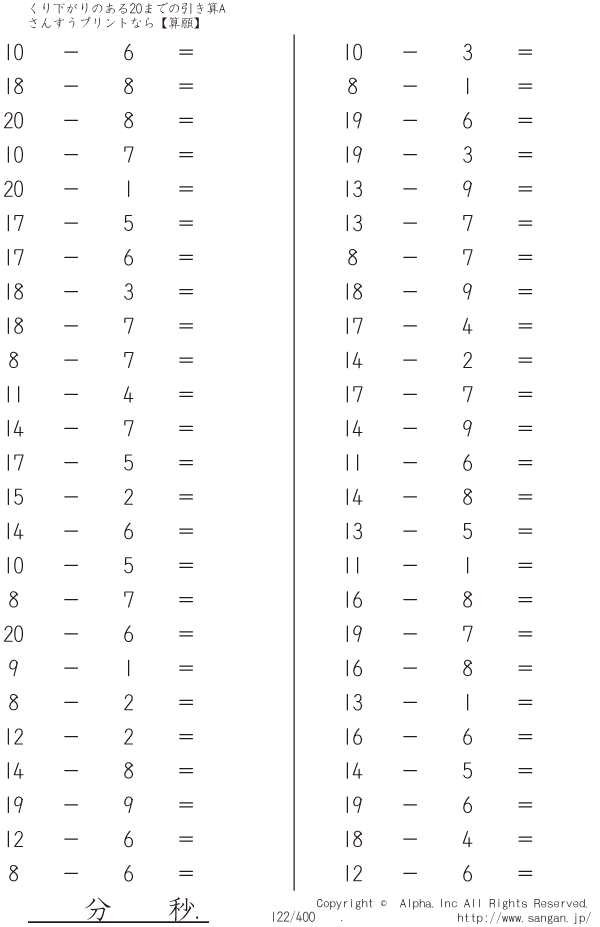 上記のボタンから「くり下がりのある20までの引き算A(1桁で引く)」の算数数学ドリル・計算ドリル(PDFプリント)がダウンロードできます。個人利用は無料です(家庭以外での配布は有料です)。