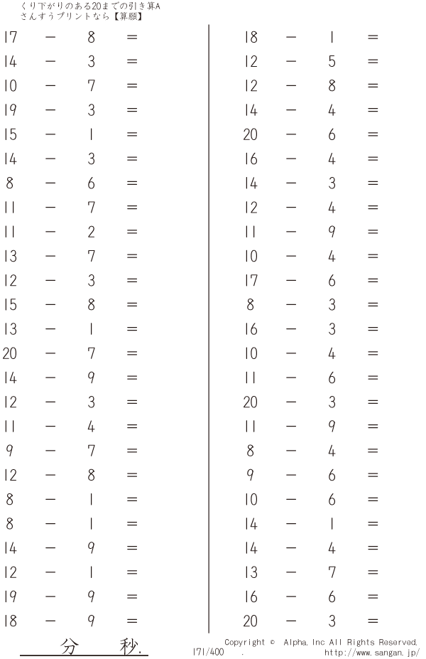上記のボタンから「くり下がりのある20までの引き算A(1桁で引く)」の算数数学ドリル・計算ドリル(PDFプリント)がダウンロードできます。個人利用は無料です(家庭以外での配布は有料です)。