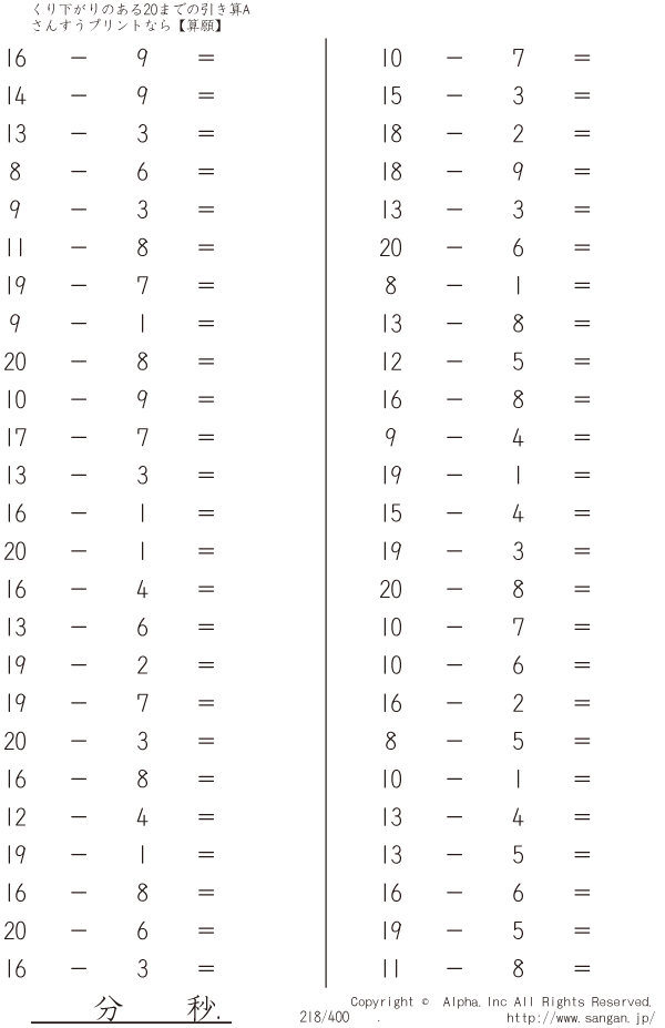 上記のボタンから「くり下がりのある20までの引き算A(1桁で引く)」の算数数学ドリル・計算ドリル(PDFプリント)がダウンロードできます。個人利用は無料です(家庭以外での配布は有料です)。