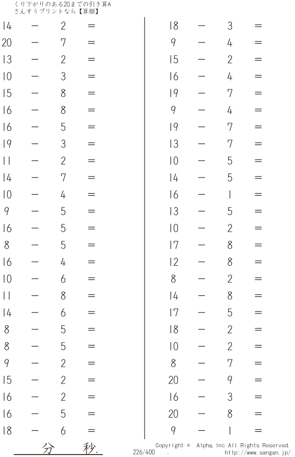 上記のボタンから「くり下がりのある20までの引き算A(1桁で引く)」の算数数学ドリル・計算ドリル(PDFプリント)がダウンロードできます。個人利用は無料です(家庭以外での配布は有料です)。