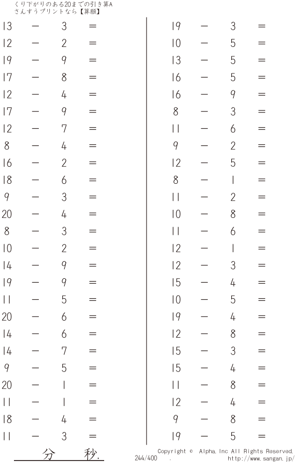 上記のボタンから「くり下がりのある20までの引き算A(1桁で引く)」の算数数学ドリル・計算ドリル(PDFプリント)がダウンロードできます。個人利用は無料です(家庭以外での配布は有料です)。